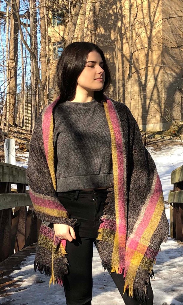 Tied at the Ends: Take the corners of the short ends of the scarf and tie the 2 ends together with a small knot to create “armholes” creating a cardigan look over your shoulders